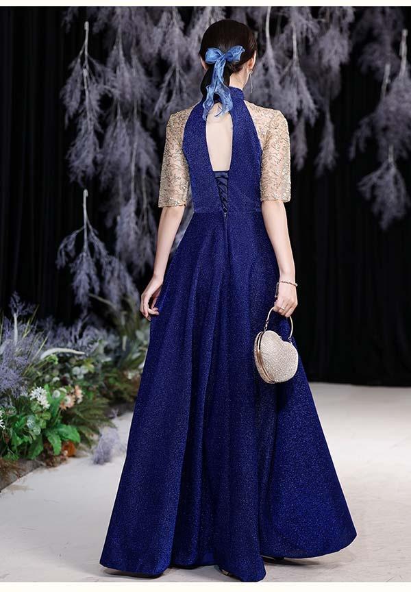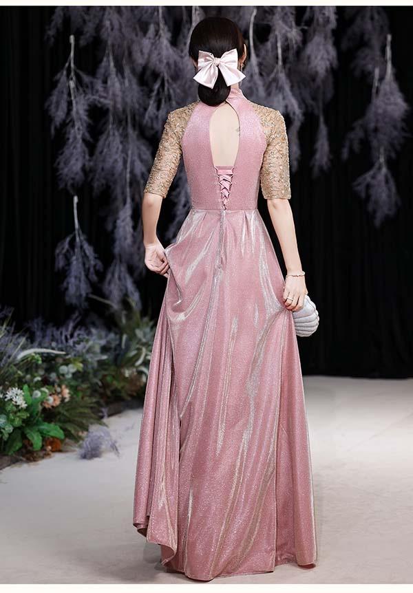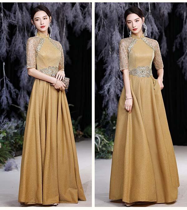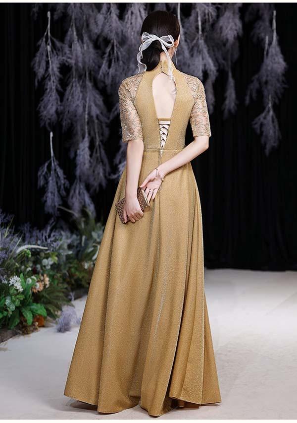 ドレス レディース パーティードレス ロングドレス 編み上げ 5分袖 袖あり ハイネック チャイナ 刺繍 キラキラ 透け感 発表会 成人式 結婚式 ワンピース 花嫁 二次会 ピアノ発表会 演奏会 披露宴ドレス 小さいサイズ