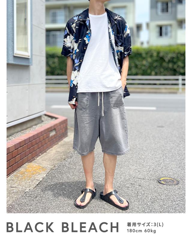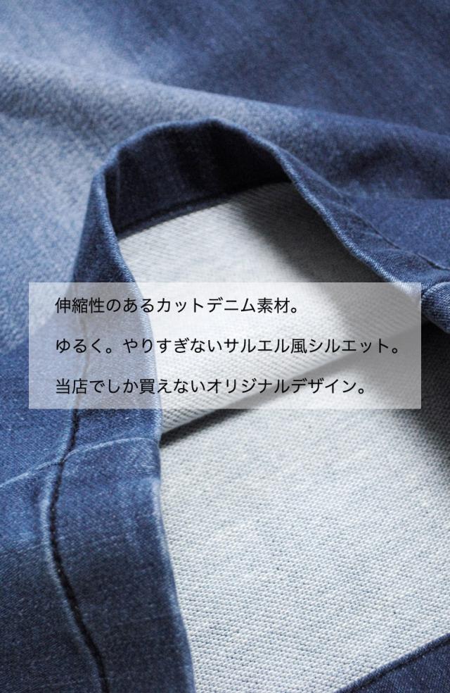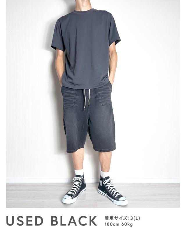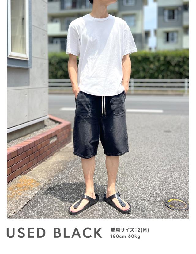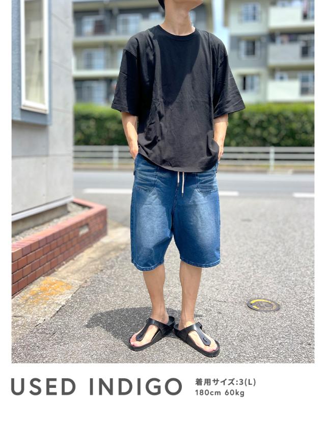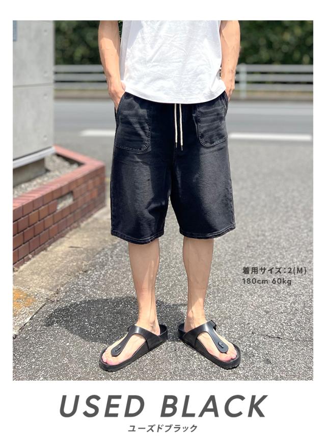 デニムのようでデニムじゃないカットデニム素材のワイドシルエットカットデニムハーフパンツ。