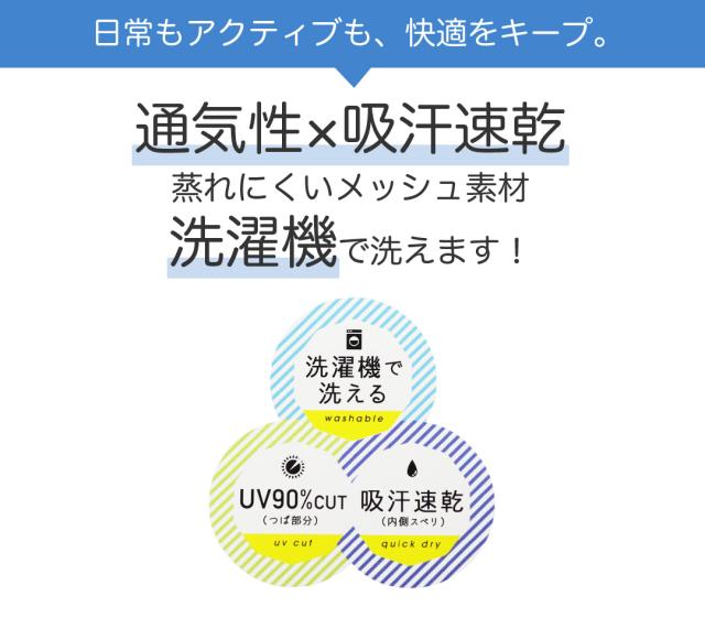 つばはカーブバイザー、バックベルトはサイズ調整可能なマジックテープ仕様。フロントパネルはメッシュが二重構造になっており、芯なしでもしっかりシルエットを保ちます。UVカットと吸汗速乾(スベリ部分)機能付きなので、スポーツやアウトドアなどアクティブシーンにも活躍するアイテムです。