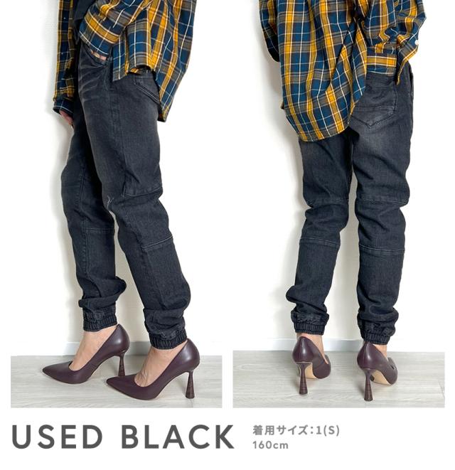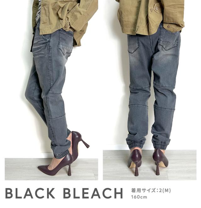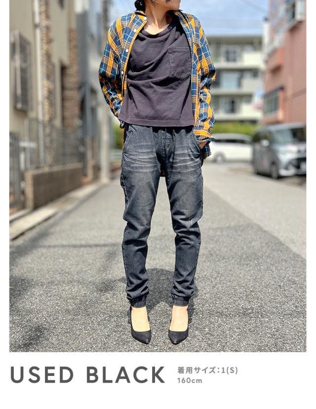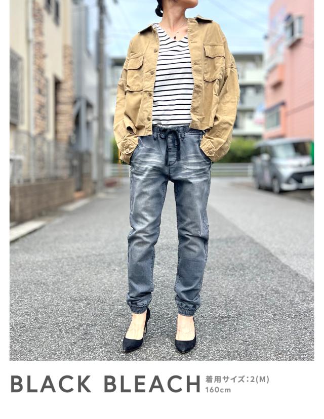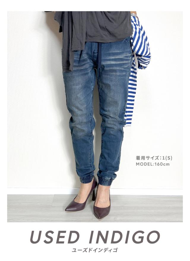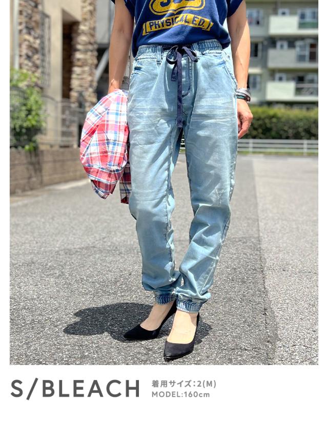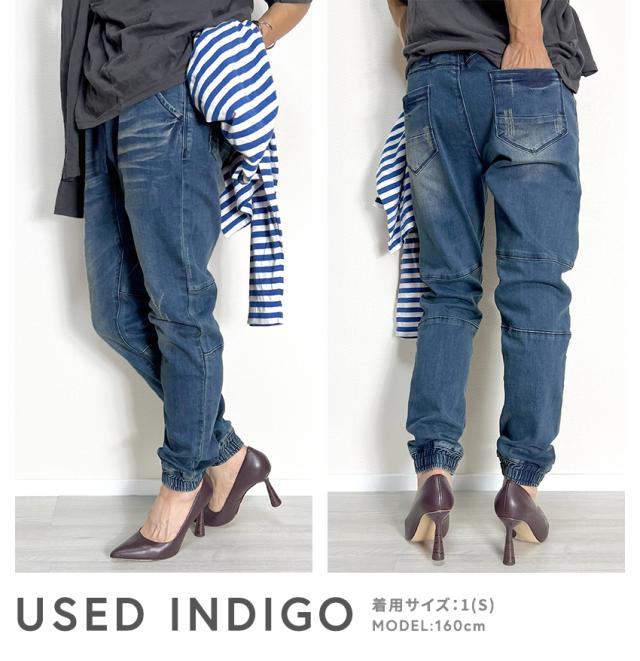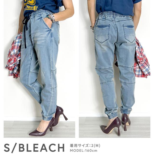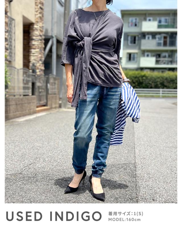 ジョガーデニムパンツです。ウエストはゴムと紐でイージーパンツスタイルになります。しっかりとしたデニム生地でUSED INDIGO、S/BLEACHはビンテージ加工、ダメージ加工がはいっています。綺麗なシルエットでトップスを選ばない万能なアイテムです。裾リブデザインでブーツやスニーカー、サンダルとも相性が良くおすすめの1本です。シンプルですが、膝裏が切替になっていたりと立体感のある雰囲気のデニムジョガーパンツです。