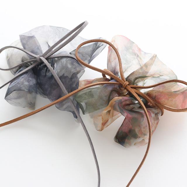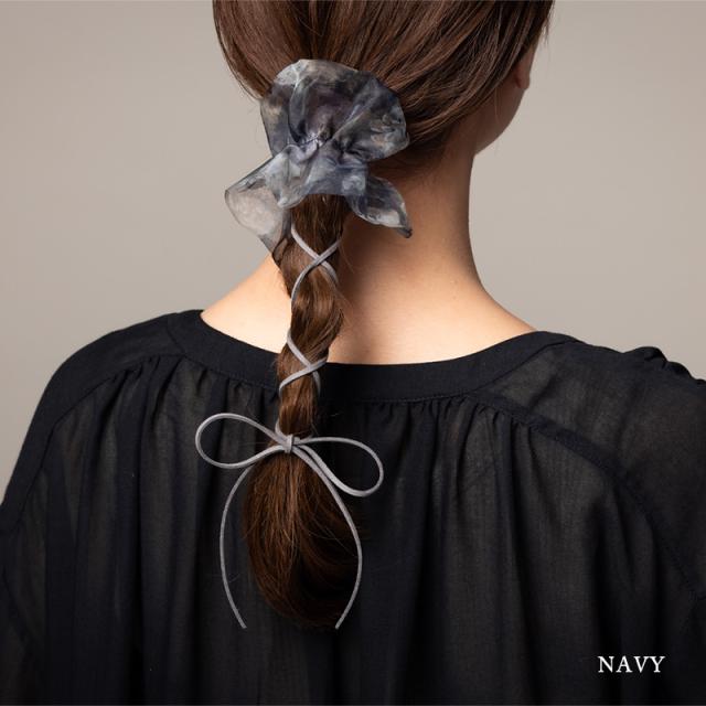 ふんわり透け感のあるオーガンジー生地にスエードリボンを合わせたポニーフックです。