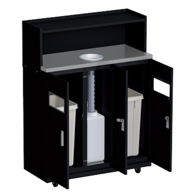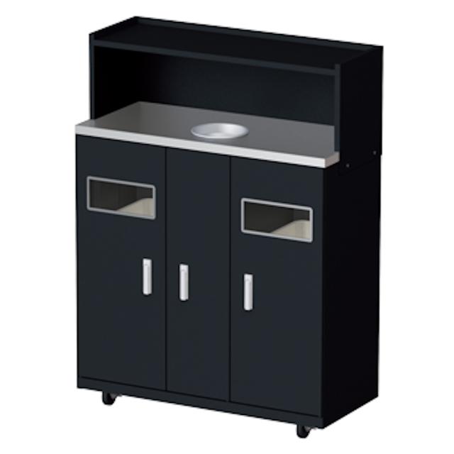飲み残しなどの液体回収とゴミの分別ができる、集約型のゴミ箱です。幅の広い天板はトレーや食器類の一時置きとして利用できます。オフィスの給湯室やセルフサービスの飲食店など、さまざまな施設で活躍してくれます。