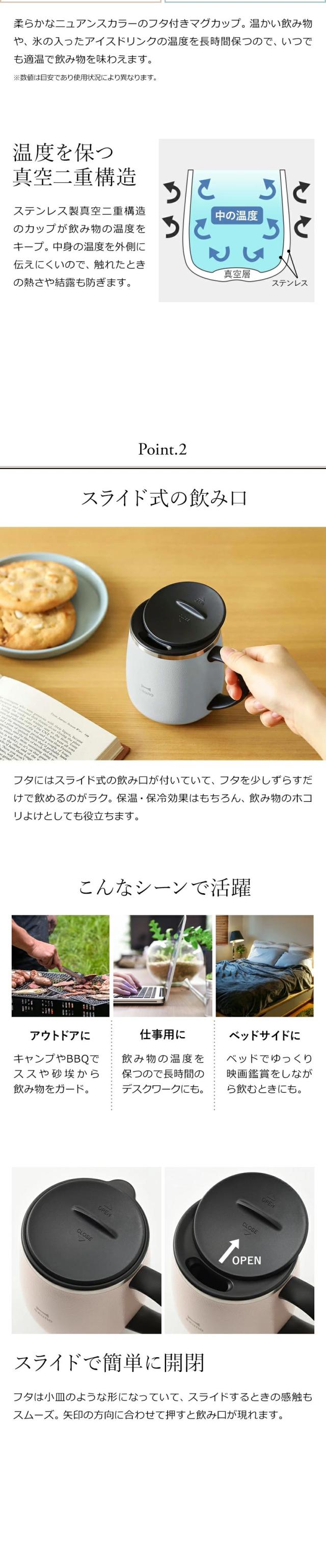 スライド式飲み口がついたフタ付きのマグカップ。保温・保冷に優れたステンレス製真空二重構造で、飲み物の適温を保ちます。フタ付きで中身がこぼれにくく、オフィスや寝室でも活躍。