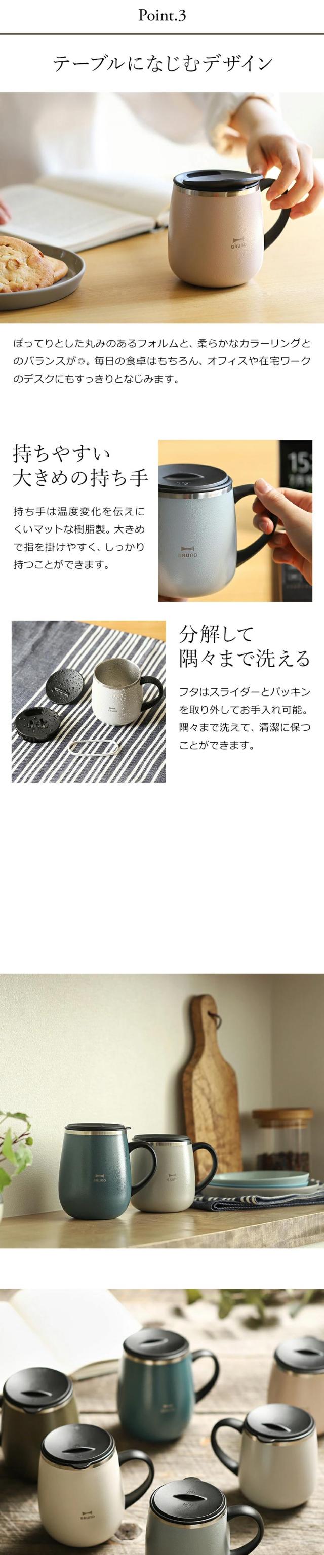 スライド式の飲み口が便利なマグカップ『 BRUNO( ブルーノ )蓋つきステンレスマグ ショート 2個セット 』。保温・保冷に優れたステンレス製真空二重構造で、ホットやアイスなど飲み物の適温を保ちます。フタ付きで中身がこぼれにくく、ホコリが入るのを防ぐのでキャンプなどのアウトドアでも活躍。容量は約320mLあり、オフィス用としても使いやすいニュアンスカラーのタンブラーです。