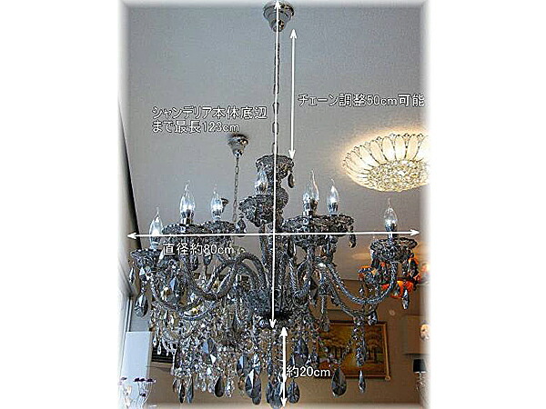 | サイズ | 高さ(天井よりシャンデリア本体底辺)約73〜123cm調整可能 直径約80cm 重量約11キロ |
