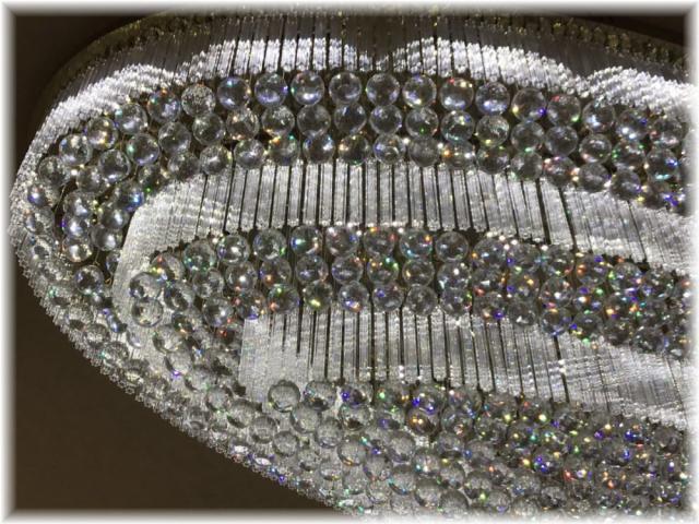 添付画像では肉眼で見る本来のクリスタルの輝きをご確認いただけませんが、58灯のLED電球が上質クリスタル水晶を通し光の屈折で光の持つ本来のカラーをかもし出しダイヤモンドのように輝きながらワット数以上の明るさでお部屋全体を照らします