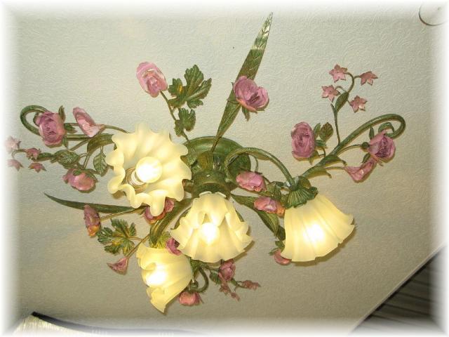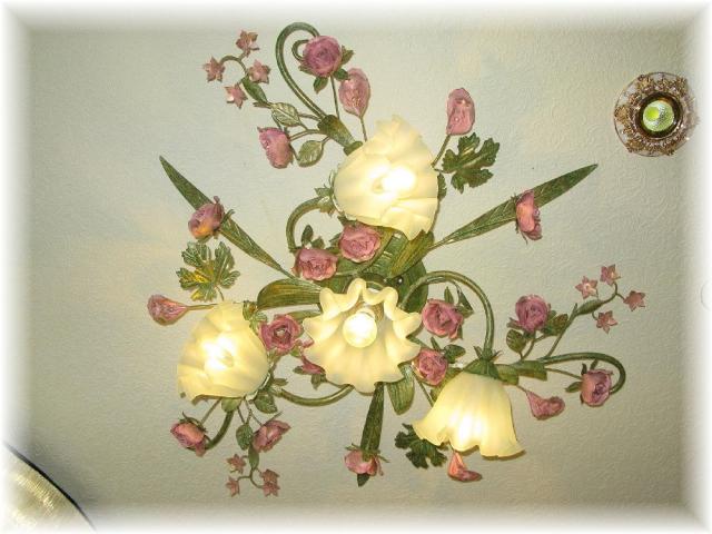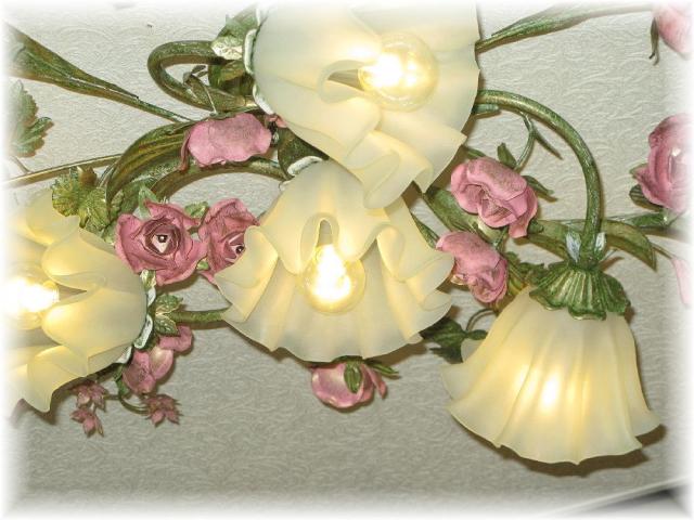 ☆電球のシェードはガラスで本体は金属で職人が1枚づつ作り合わせ、薔薇のモチーフを散りばめアンティーク調のペイントを施した手作りのシャンデリアです♪