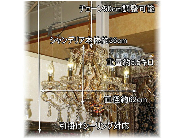高さシャンデリア本体(飾り部分除く)約36cm 化粧チェーンで最長110cmまで調整可能 直径約62cm 重量約5.5キロす