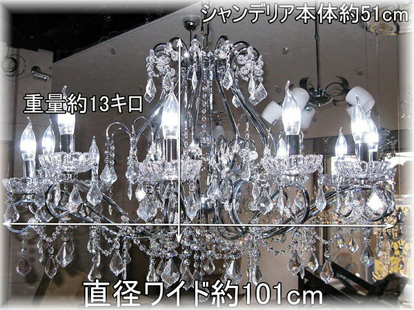 | サイズ | 高さシャンデリア本体(飾り部分除く)約51cm 化粧チェーンで最長140cmまで調整可能(140cm以上希望の場合ご希望の長さに調整させて頂きます) 直径約101cm 重量約13キロ |