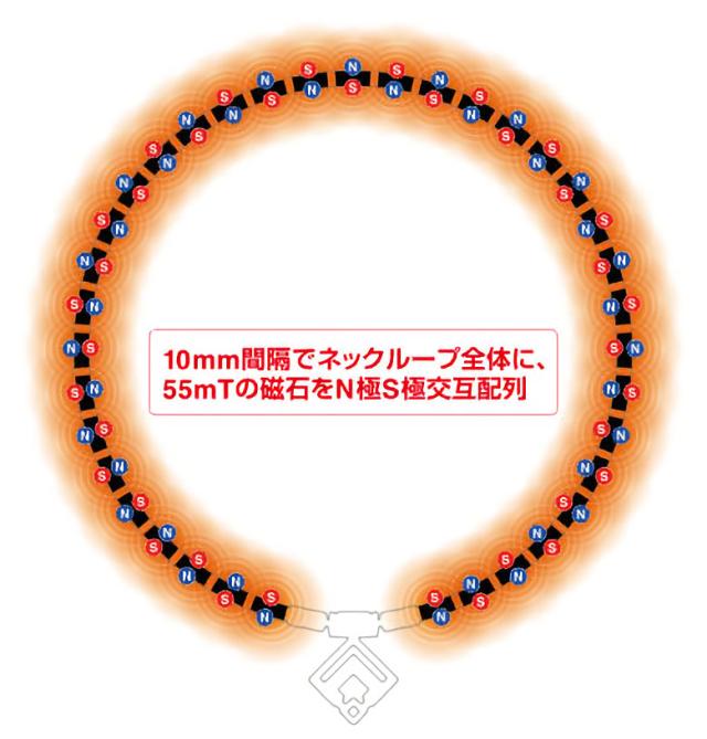 ネックループ全体には55mTの磁石がコラントッテ独自のN極S極交互配列で10mm間隔に配置されています。この配列により磁力を広範囲に影響させることができ、首・肩の血行を改善、首・肩のコリを緩和します。TAO ネックレス スリム ARAN miniは首全体の血行を改善、コリに効く磁気ネックレスです。