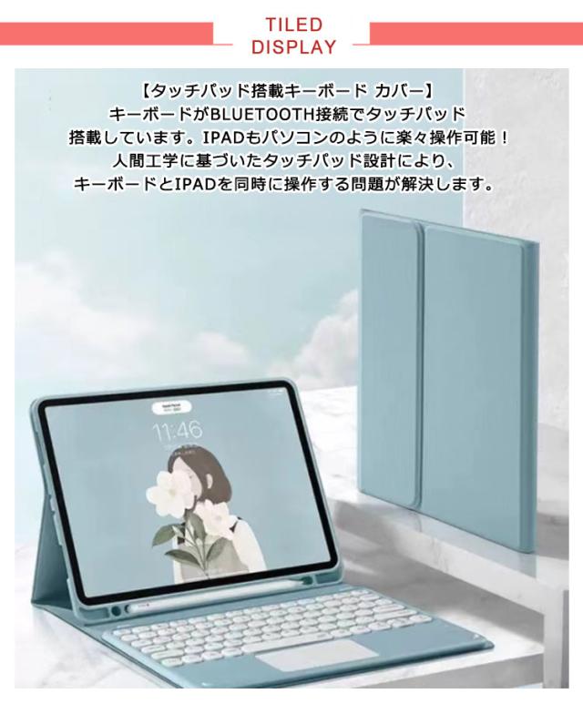 | 【タッチパッド搭載キーボード カバー】キーボードがBluetooth接続でタッチパッド 搭載しています。Ipadもパソコンのように楽々操作可能!人間工学に基づいたタッチパッド設計により、キーボードとIpadを同時に操作する問題が解決します。 【分離式キーボード】分離式キーボードを外し、保護ケースとしても使えます。 【ペンシルホルダー付き】Apple pencil用のホルダーとアダプタースロットが付きますので、アップルペンシルに最大性の保護を提供します。 【優れた耐久性・弾力性:】 裏側には柔軟ハニカム3D構造を採用しており、放熱性に優れて、電池寿命を延長されます。 外側は高級PUレザーで、ipad に合わせた作り、全面保護、耐摩耗性 傷つき防止します。 穴は特別に加工されて、iPadの電源ボタンと音量ボタンもしっかり保護します。 【ファッションデザイン:】 専用のショートカットが並んでいるので、ボタンを押すだけでWebを検索や明るさを調整しなと便利さを楽しむことができます。 ほかに、キーボードはAndroid、IOSまたはWindowsシステムスのタブレットPCやスマートフォンにも対応できます。 | |