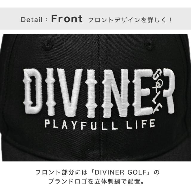 DIVINER GOLF(ディバイナーゴルフ)『ロゴベースボールキャップ』【ロゴベースボールキャップ】●Design/デザインDIVINER GOLF(ディバイナーゴルフ)から、刺繍でブランドロゴを配置したロゴキャップが登場。「ゴルフという人生を遊び尽くせ」というDIVINER GOLFのコンセプトのもと、様々なカラー展開で遊び心感じるひと品。●Fabric/生地感スポーツキャップ特有のしっかりとした素材感でキレイな形を保つことができる。またキャップのアジャスターにはストラップバッグを採用しており、自由にサイズの調節が可能。