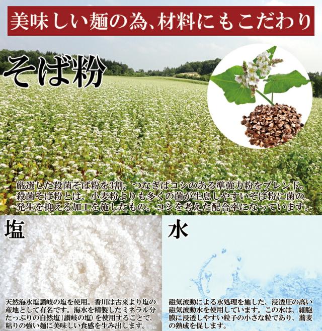 ■原材料名:【麺】小麦粉、そば粉、食塩 / 酒精、pH調整剤、加工でん粉【つゆ】しょうゆ(本醸造)、砂糖、食塩、たん白加水分解物、かつおぶしエキス / 調味料(アミノ酸等)、アルコール、カラメル色素、(一部に小麦・大豆を含む)