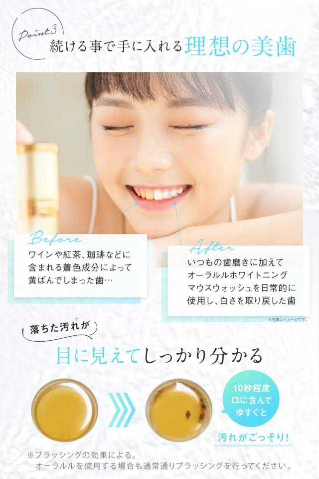- 私は歯磨き粉と合わせて使っているんですが、歯がツルツルになりお口のスッキリ感が好きです。 ホワイトニング効果は、まだわかりません。