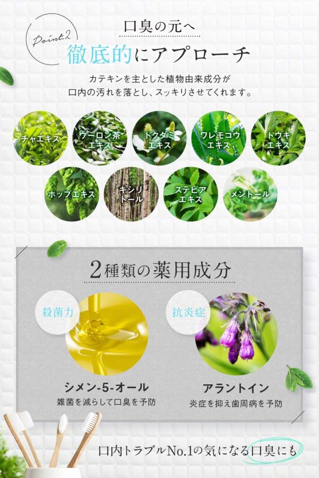 【その他成分】精製水、ソルビトール液、茶エキス-1、トウキエキス -1、ホップエキ ス、ワレモコウエキス、ウーロン茶エキス、ドクダミエキス、BG、エタノール、無水エタノール、メントール、キシリトール、ステビアエキス、メチルパラベン、無水クエン酸、クエン酸Na、カラメル