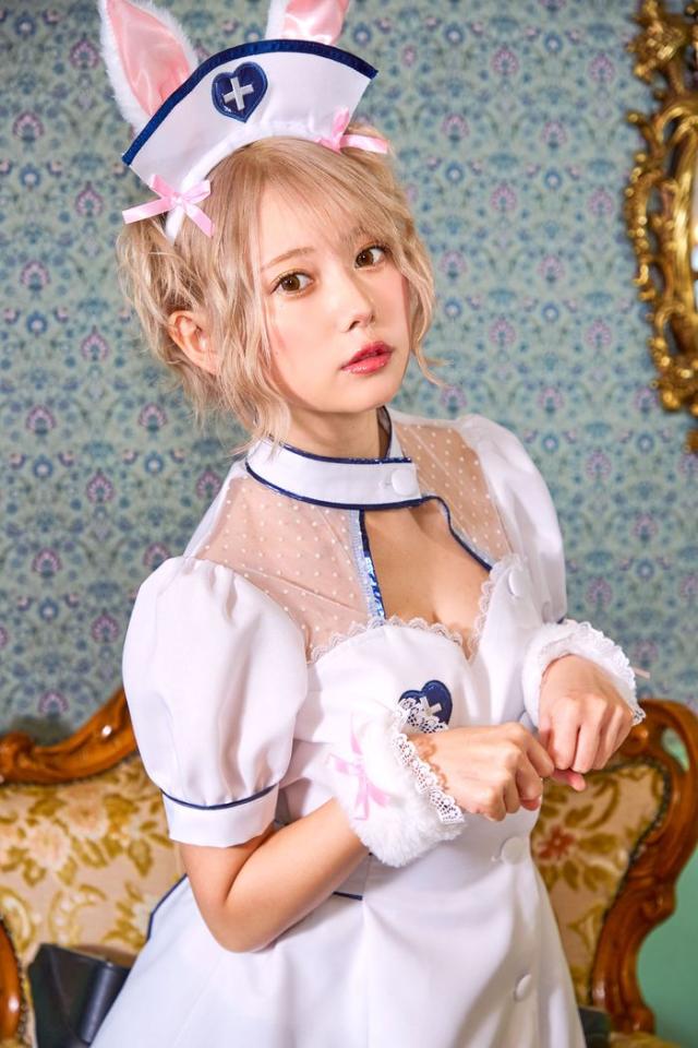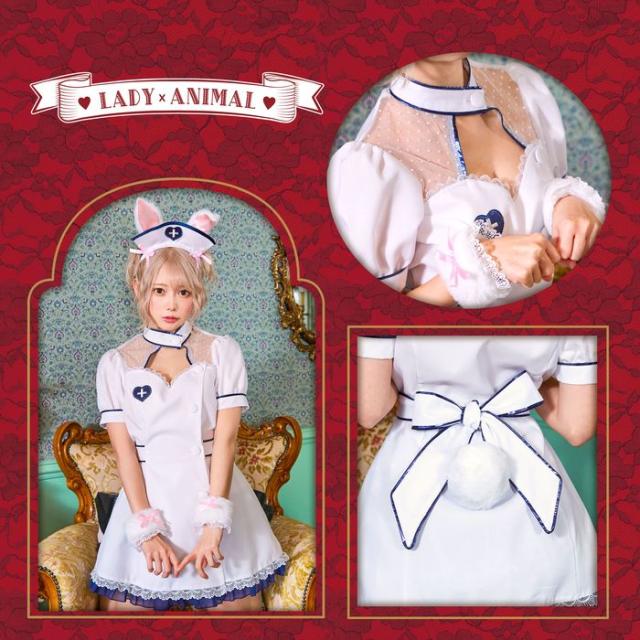 ナース×うさぎが可愛い!「レディアニマル」シリーズ。うさ耳が生えたナースカチューシャ。ワンピースは胸元を綺麗に魅せるデザイン。肩周りのドットチュール生地が程よくセクシー。ハートマークとパイピングはメタリックネイビーでお洒落な印象。ウエストリボンをきゅっと締めてスタイルアップ。スカートはふんわりガーリーで裾に重ねたレースが豪華です。耳と同じファー素材のカフスがガーリーなナース。しっぽはピン付きで取り外せる為、小物単品でもお使いいただけます。