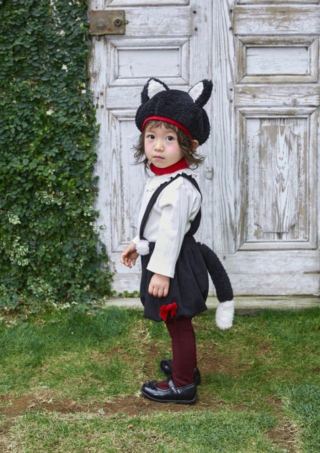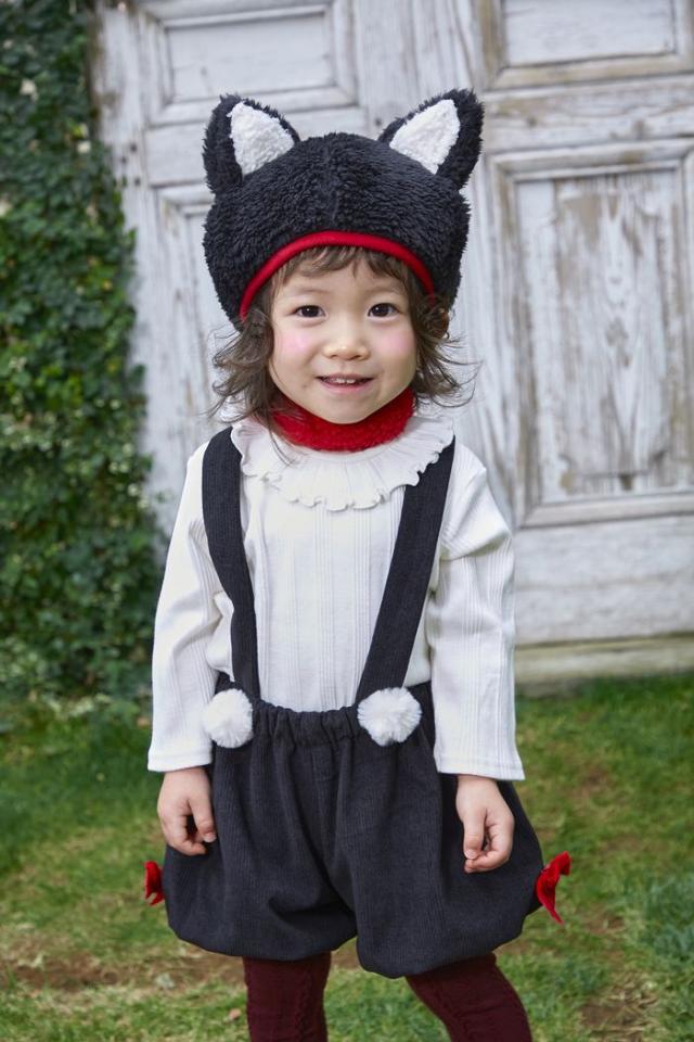 普段着にアニマルモチーフを落とし込み、モノトーンやくすみカラーなど色味にもこだわった新シリーズ「Honeytail(ハニーテイル)」。全ての愛するかいじゅうたちへ。SNSアンケートをとりながらママがほしい!着せたい!を形にしました。大きめな猫耳が可愛いベレー帽は被り口の赤が差し色に。後ろがゴムになっているので脱げにくいのも嬉しいポイント。赤いチョーカー付きです。パンツの赤いサイドリボンは手縫いなので好みで取り外しも可能。ウエストのポンポンはふわふわ素材、太めのしっぽがもこもこで存在感があります。パンツの紐は後ろボタンで長さの調整が可能。裏地は綿100%で肌触りも柔らか。ウエスト、裾口もゴムなので着脱簡単。ベレー帽もパンツも単品コーデが楽しめます。