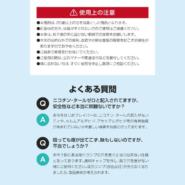 | ※吸引回数に関する注意事項 | 本製品はリキッド1ml当たりの吸引可能回数を約300回と定義しています。当店のスタッフが検証して【実測値】を表記しておりますので、安心してお買い求めください。 また、使用可能回数は目安であり、使用状況や環境温度・吸引量の個人差などにより異なります。 |