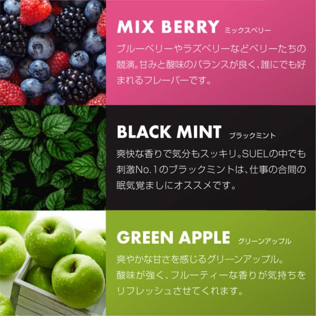 | フレーバー | スーパーミント、ブルーベリー、ストロベリー、ミックスベリー、ブラックミント、グリーンアップル、バニラ、マンゴー、マスカット |