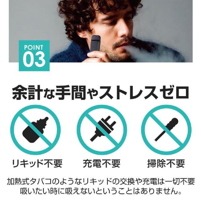 加熱式タバコのようなリキッドの交換や充電は一切不要。吸いたいときに直ぐ喫煙可能です。