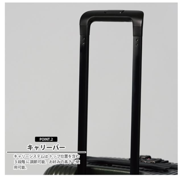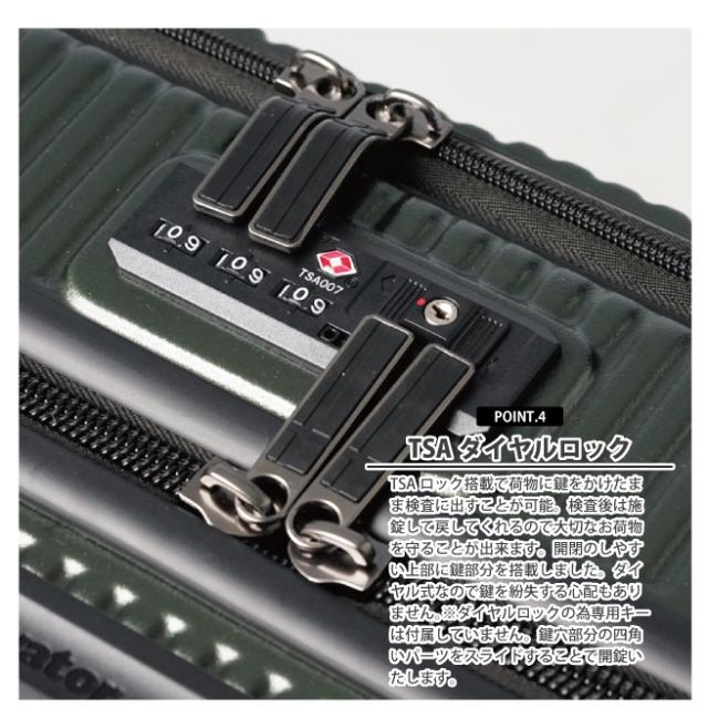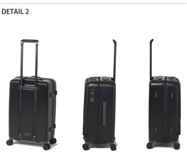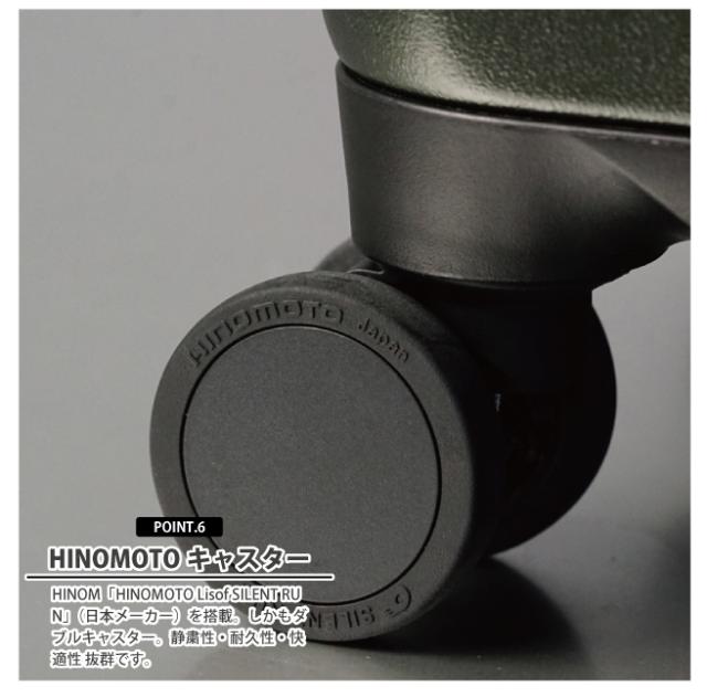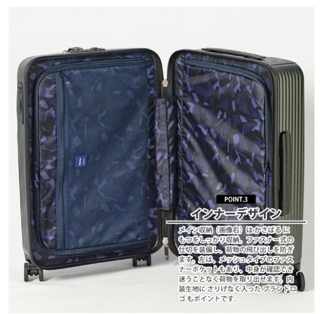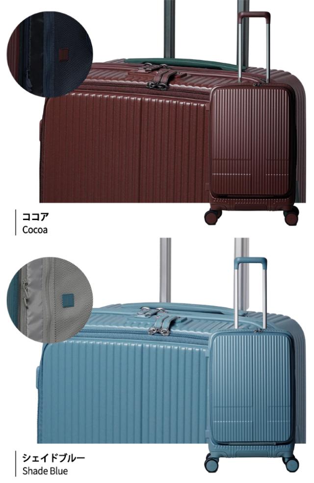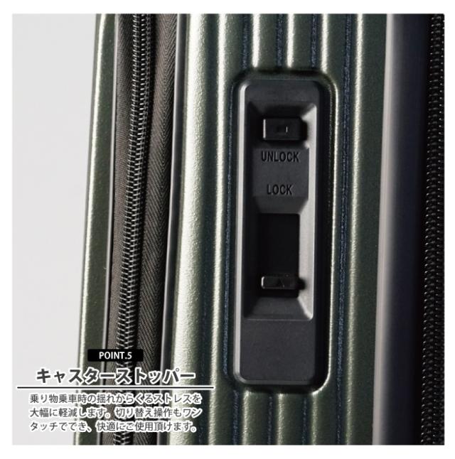 フロントオープンポケット/静音双輪キャスター(HINOMOTO製)/ストッパー機能/TSAダイヤルロック対応/ブレーキシステム搭載/軽量設計