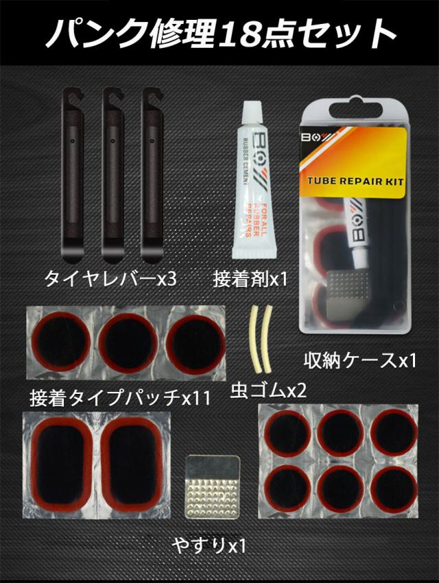 【良い素材】:自転車パンク修理キット バイク修理 応急用 レバー・ヤスリ・パッチ・ノリ 全揃え 18点セット 初心者にも楽々