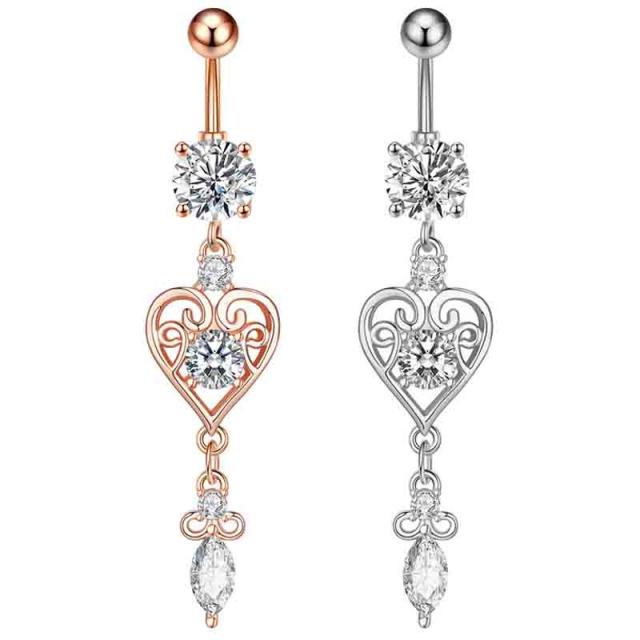 ピンクゴールドとシルバーから選べるキラキラのキュービックジルコニアをセットしたハートのチャームが揺れる14ゲージのバナナバーベル型ボディピアス。