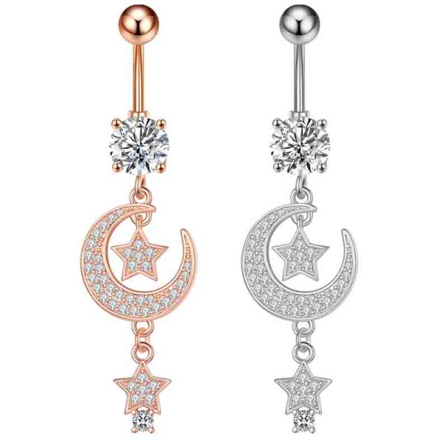 ピンクゴールドとシルバーから選べるキラキラのキュービックジルコニアの三日月と星が揺れる14ゲージのバナナバーベル型ボディピアス。