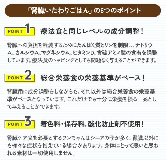 犬用 腎臓いたわりごはんは、腎臓への負担を軽減するためにたんぱく質とリンを制限し、ナトリウム、カルシウム、マグネシウム、ビタミン D、含硫アミノ酸の含有をコントロールしています。