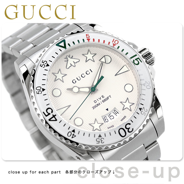7年保証キャンペーン グッチ ダイヴ 40mm スイス製 クオーツ メンズ 腕時計 YA136336 GUCCI DIVE アナログ シルバー ◆1921年、グッチオ・グッチは革製品の会社を起業し、フィレンツェに小さな鞄店を開業。ブランドに対する彼のビジョンは、ロンドンと、彼がサボイ・ホテルで働いていた時に見た英国貴族の洗練された審美眼から培われたものです。財布や革製品以外にもアクセサリーや腕時計も品質の高さや、洗練されたデザインが人気で一気に高級ブランドの地位を確立しました。今では名を知らない人はいないぐらい世界的に有名なブランドです。 印象的なベゼルと文字盤デザインがスポーティーさを演出。蛍光塗料が施された針とインデックス、6時位置には日付表示が備えられ、視認性にも実用性にも優れています。オンオフ問わずにお使い頂ける、様々なファッションに合わせやすいカラーリングも魅力です。 大切な方へのプレゼントはもちろん、自分へのご褒美にもおススメです。