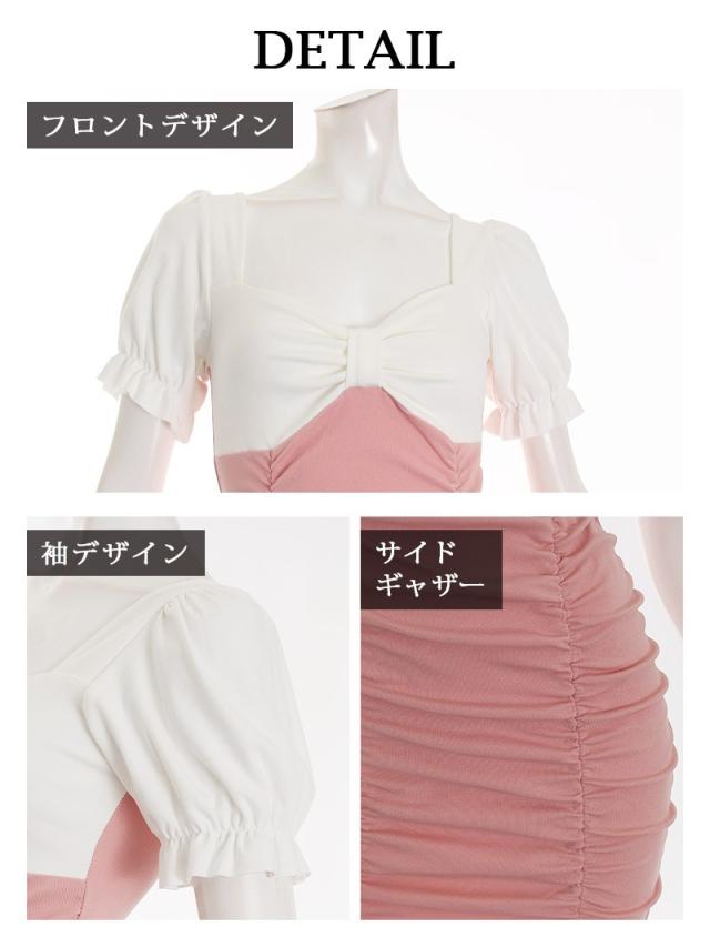 ☆可愛いパステルカラーと胸元のリボンデザインが女の子らしいキャバワンピは広めにカットされたスクエアネックからの谷間魅せでセクシーさをプラスできちゃうミニドレスです♪