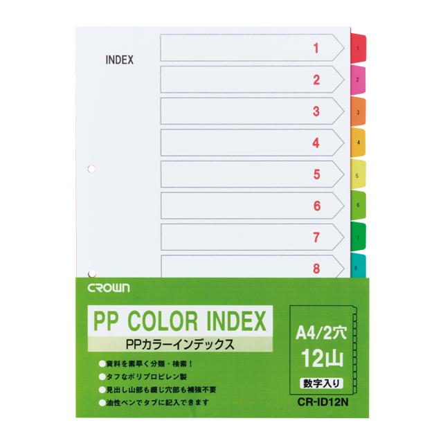 ●規格:A4判タテ型●穴数:2穴●仕様:12色12山13枚1組●外寸:縦297×横222mm●材質:再生PP