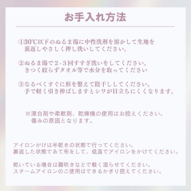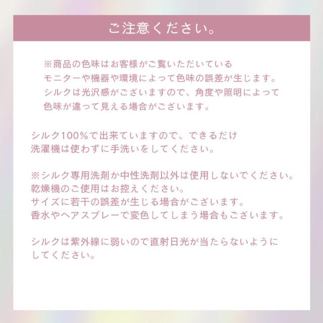 天然シルク100%製品ですので、大変デリケートです。お洗濯の際は洗濯機は使用せず手洗い洗濯をオススメします。