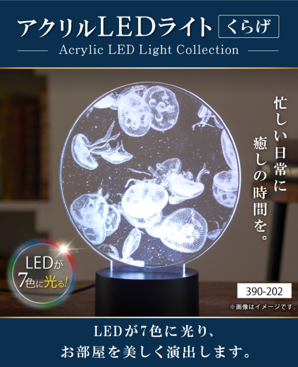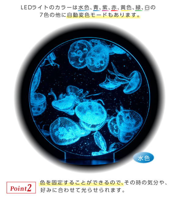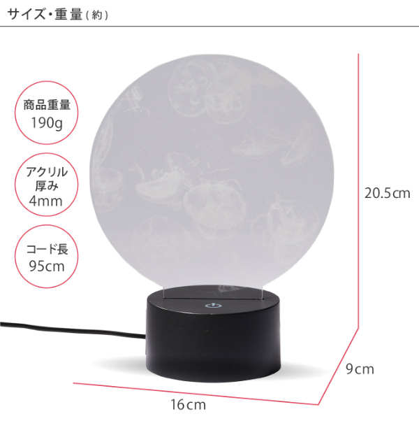 【品番】390-202【商品サイズ(約)】16×9×20.5cm【商品重量(約)】190g【電源】USB電源(ケーブル付属)【LEDモード】赤、緑、青、黄、水色、紫、白、自動変色モード【材質】アクリル、ABS樹脂【スイッチ】タッチセンサー式【生産国】中国【注意事項】※クラゲはレーザー彫刻の為、動きません。
