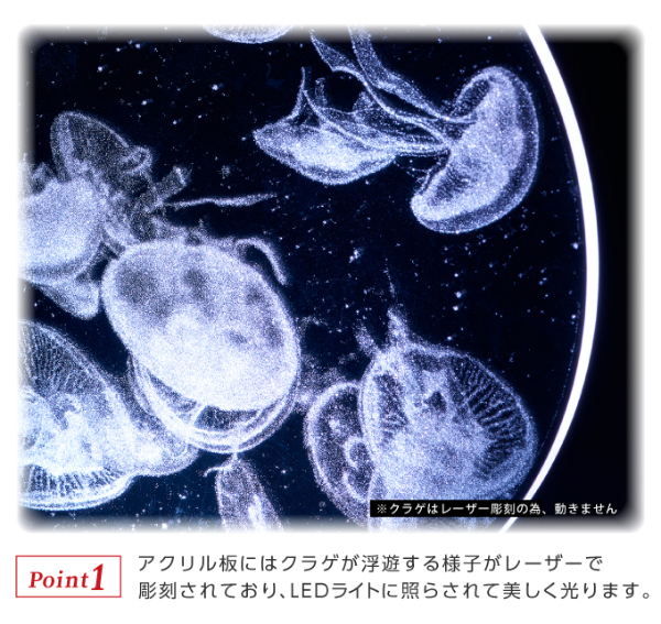 インテリアだけじゃない!使って学べる、楽しい、癒されるをコンセプトにした商品。数年前から水族館でクラゲブームが起きていることをご存じでしょうか。クラゲは海月と書き、その様は海に浮かぶ月と形容されるほど。そんなクラゲをモチーフにしたルームライトになります。