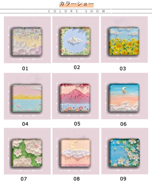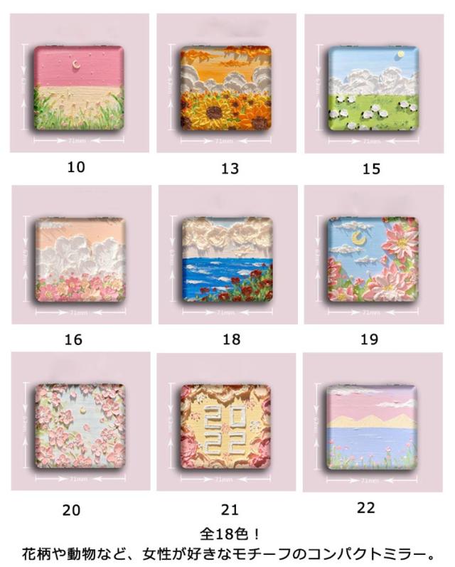 | 全18色!花柄や動物など、女性が好きなモチーフのコンパクトミラー。 折りたたみの手鏡は2枚のうち片面が拡大鏡になっており、ポイントメイクの確認に役立ちます。 スリムなうえに手のひらに収まる大きさで、バッグやポーチに入れやすいことから、自宅でも外出先でも便利に使ってもらえます。 女の子らしい印象を与えてくれる手鏡は、かわいいファッションが好きな女性におすすめです。 | |