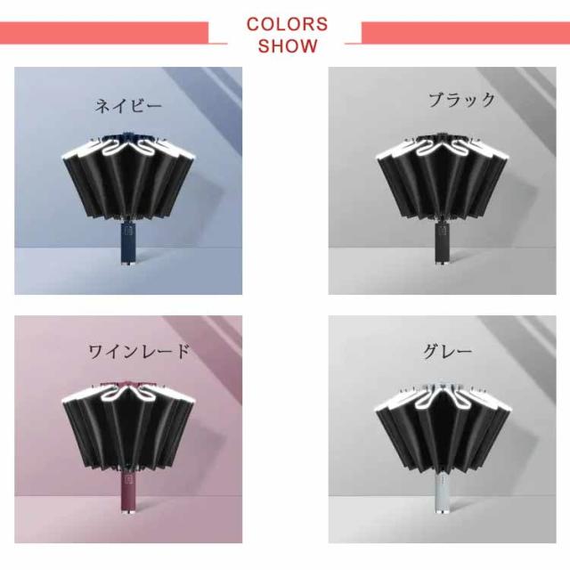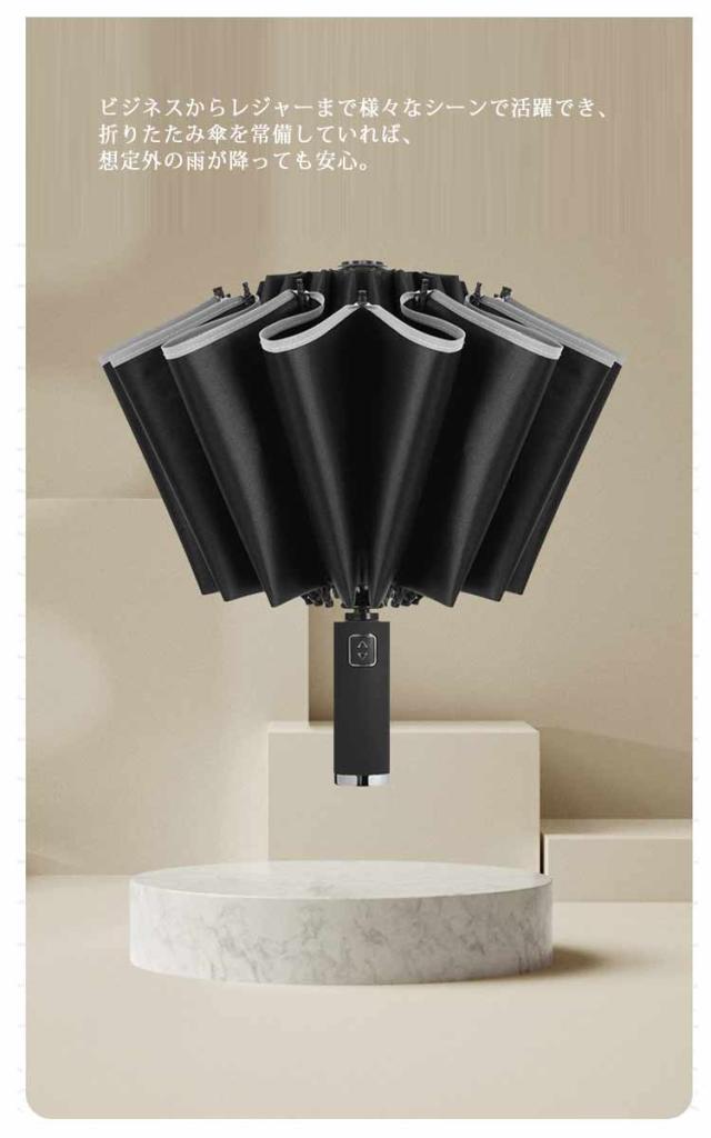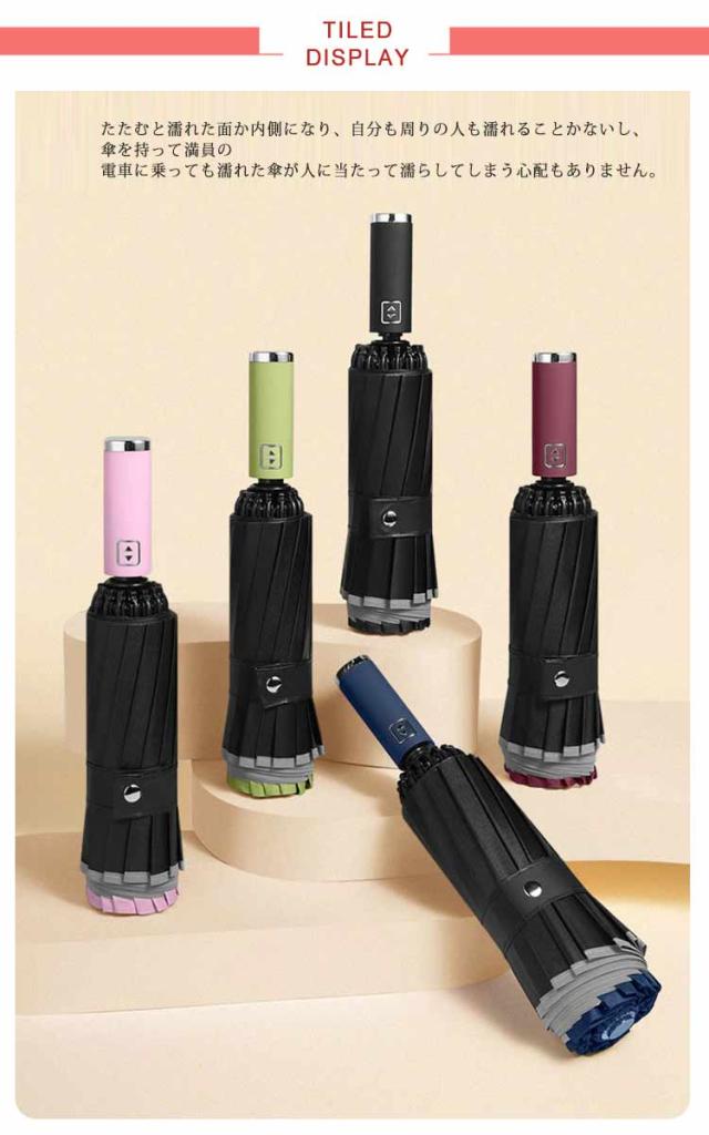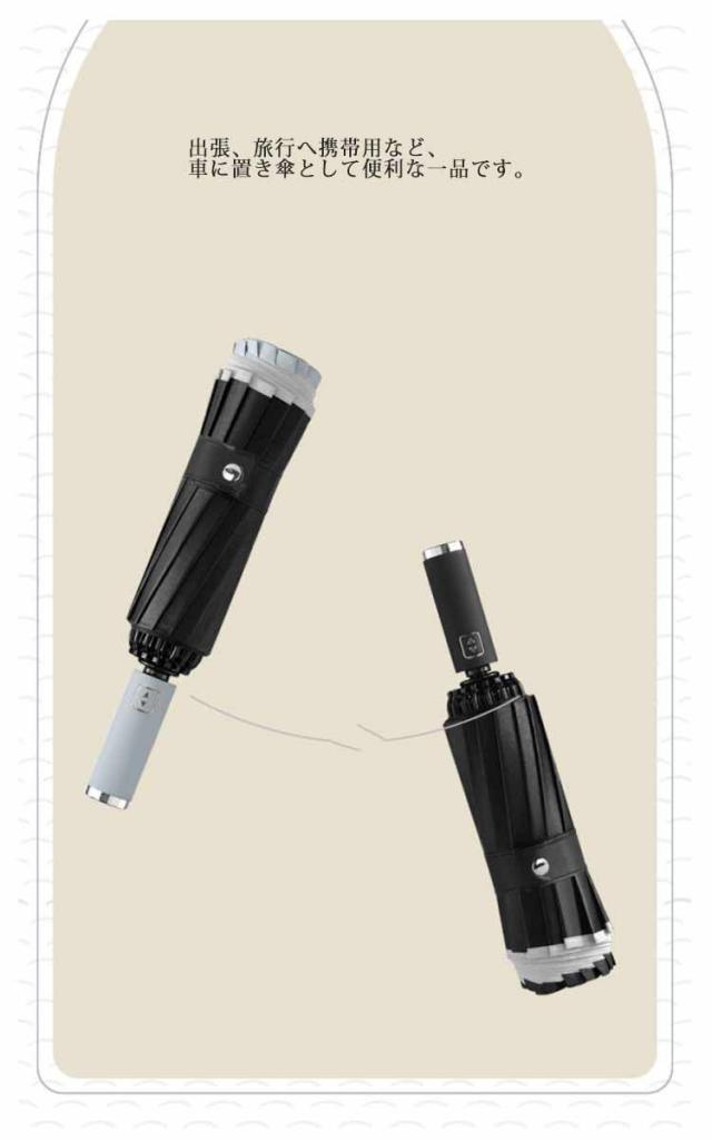 | 自動開閉逆折り傘!たたむと濡れた面か内側になり、自分も周りの人も濡れることかないし、傘を持って満員の電車に乗っても濡れた傘が人に当たって濡らしてしまう心配もありません。 片手でワンタッチで簡単に開け閉め折りたたみ傘です。出張、旅行へ携帯用など、車に置き傘として便利な一品です。 ビジネスからレジャーまで様々なシーンで活躍でき、折りたたみ傘を常備していれば、想定外の雨が降っても安心。 折り畳める傘の骨組みは構造力学を運用して、16本の構造の鋼とガラスの繊維の複合構造の傘の骨はより安定していて、しなやかで堅固。 アルミニウム合金の材質で、強風に耐えられる高密度グラスファイバーを採用し、豪雨や強風にも安心です。 反射テープ付き、夜道でも安全。後方から近づく車のライトに反射して自分の位置を知らせるので、日暮れ時と夜道の交通安全に役に立ちます。 | |
