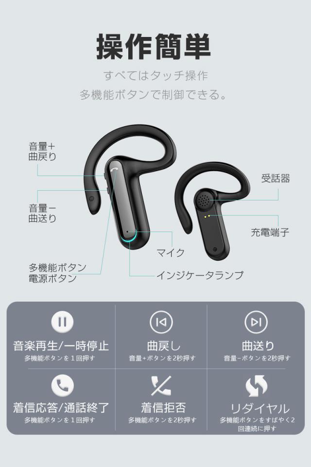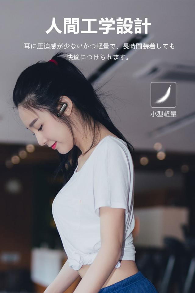 【軽快に装着できる耳かけ式】本製品は、イヤーフックが付き、耳にかけて使用するワイヤレスイヤホンです。耳の上へ乗せるようにして使用できるので、カナル型イヤホンより圧迫感が少なく使用でき、着脱もしやすくて、ヘッドホンよりも手軽に使えるのが魅力の一つです。
