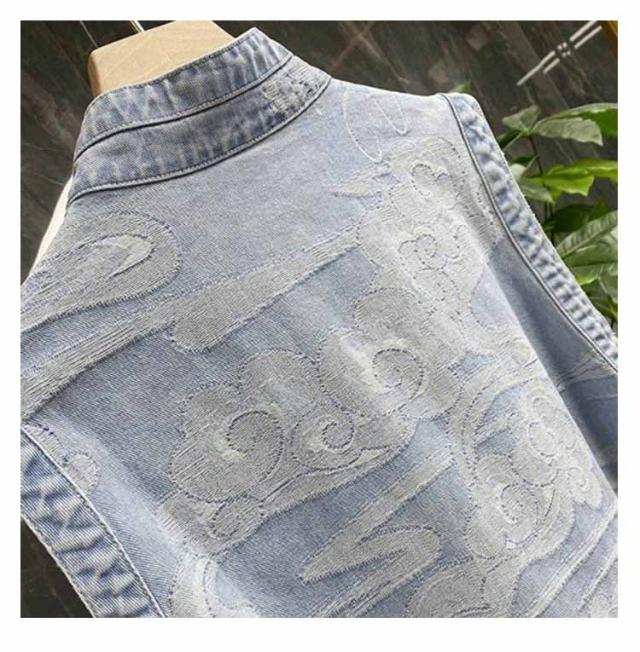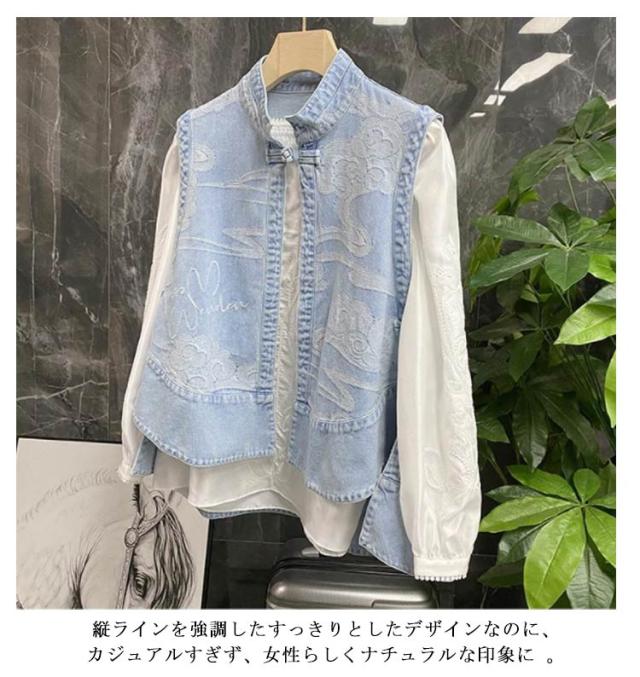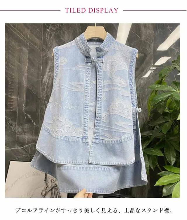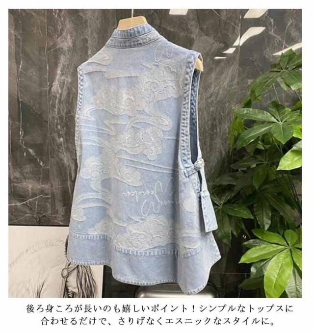 送料無料 森ガール エスニック ベスト デニムジャケット ノースリーブ Gジャン デニム ベスト アウター レイヤード 重ね着 トップス ロング丈 薄手 サイドスリット ラウンドテール アジアン 古着風 春 夏 秋