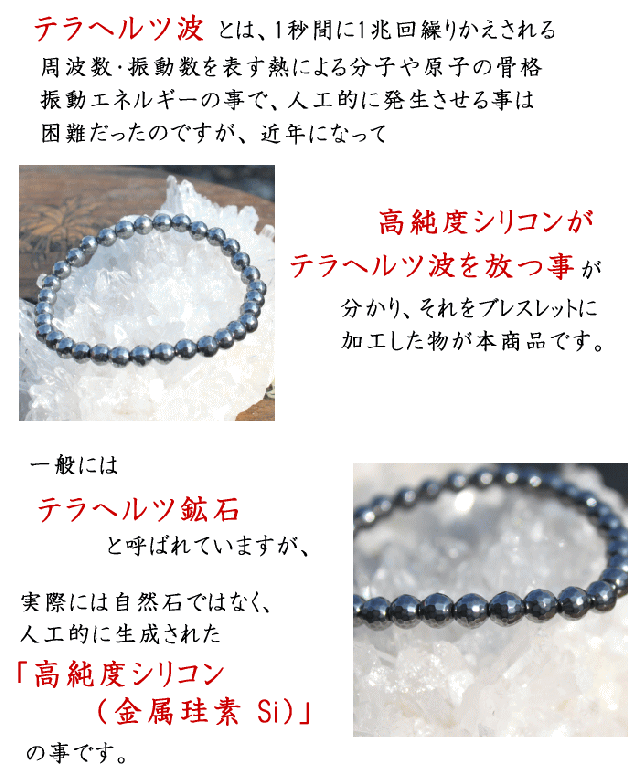 テラヘルツ波とは、1秒間に1兆回繰りかえされる周波数・振動数を表す熱による分子や原子の骨格振動エネルギーの事で、人工的に発生させる事は困難だったのですが、近年になって高純度シリコンがテラヘルツ波を放つ事が分かり、それをブレスレットに加工した物が本商品です。