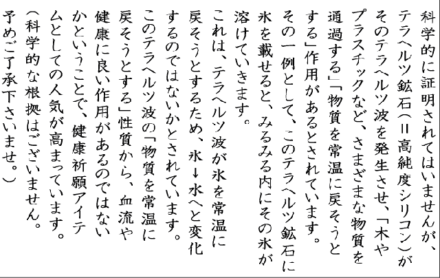 科学的に証明されてはいませんが、テラヘルツ鉱石(=高純度シリコン)がそのテラヘルツ波を発生させ、「木やプラスチックなど、さまざまな物質を通過する」「物質を常温に戻そうとする」作用があるとされています。