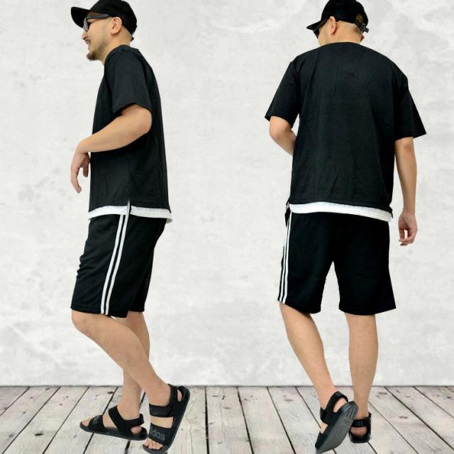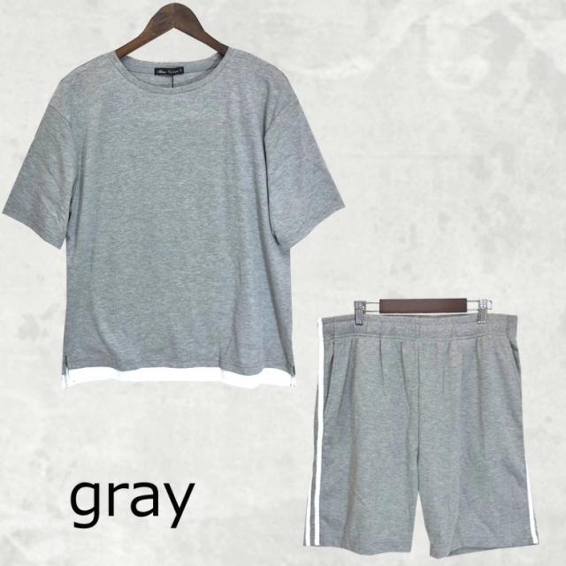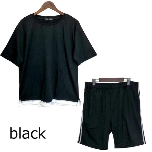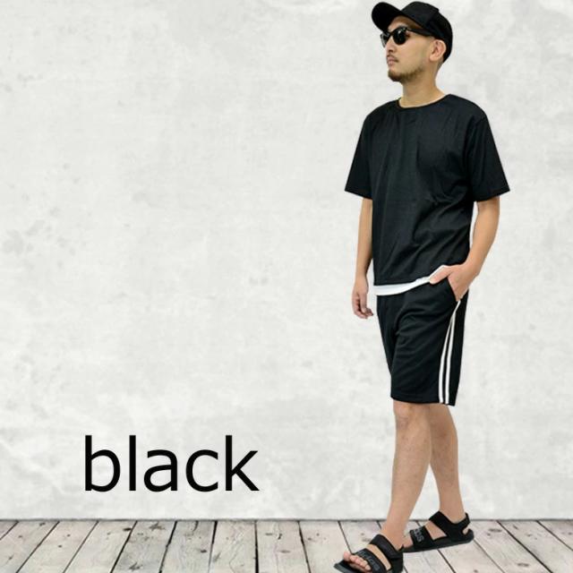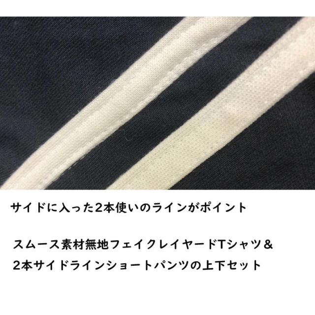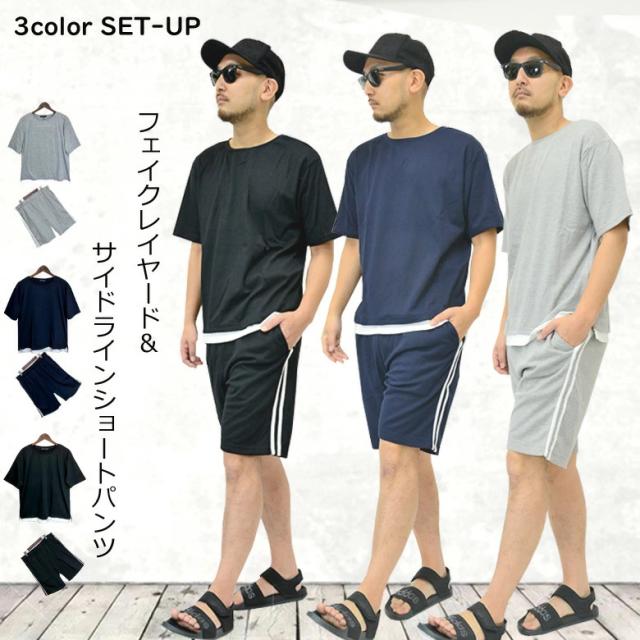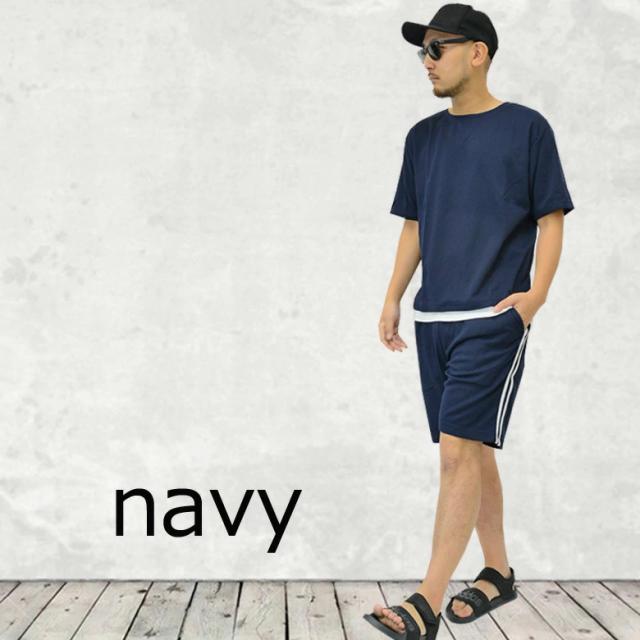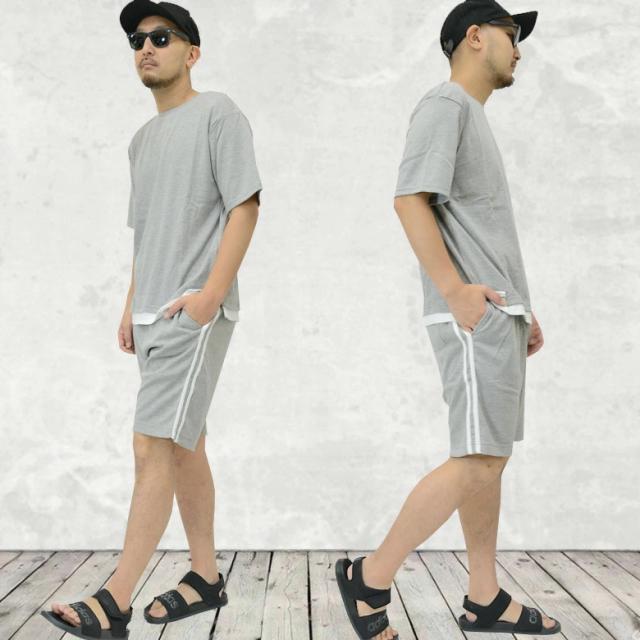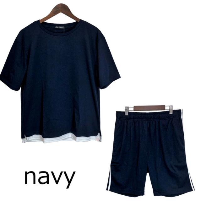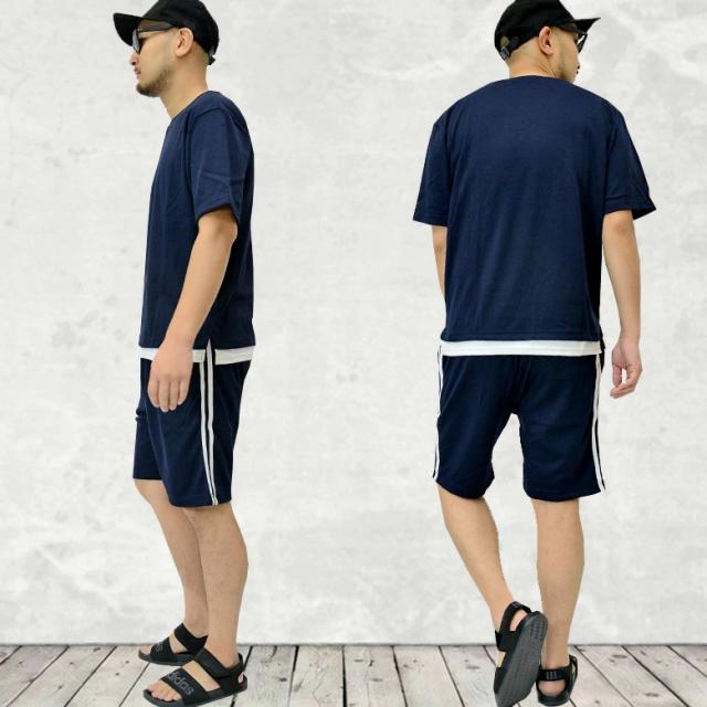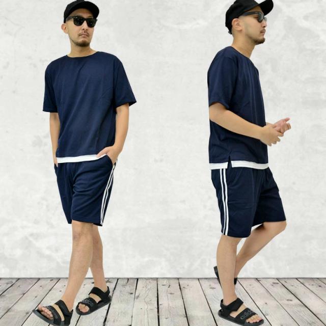 【閉店セール】上下セット スムース素材レイヤードTシャツx2本ラインショートパンツ上下SET 51422 カジュアル シンプル 清涼感 トップス カットソー 無地Tシャツ メンズTシャツ 無地 半袖 グレー ネイビー ブラック Tシャツ メンズ 寝巻