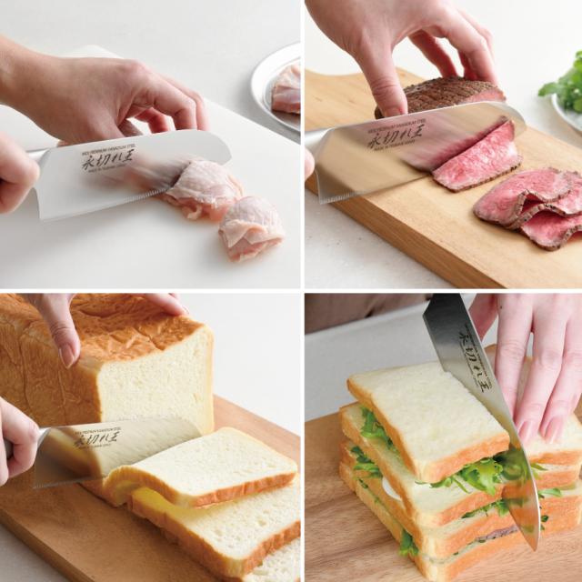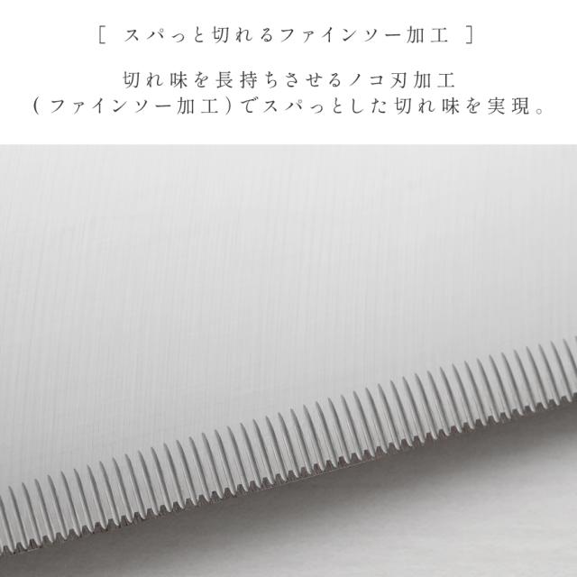 野菜等を切る直刃とパン等を切る波刃の長所を生かし、良く切れて長く切れ味を持続させる細かなノコ刃加工(ファインソー加工/特許登録済み)を施してあるので魚やバラ肉もスパッと切れます。刃はステンレス鋼とモリブデンバナジウム鋼が混合されたサビに強く粘り強い材質です。