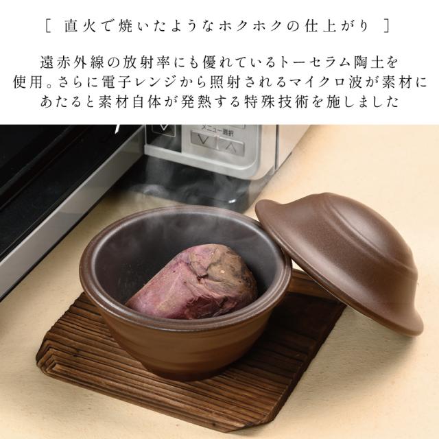 電子レンジでわずか10分。ホクホクの焼き芋が焼けます。遠赤外線の放射熱にも優れているトーセラム陶土を使用し、さらに電子レンジから照社されるマイクロ波が素材にあたると、素材自体が発熱する特殊技術を施しました。このダブルの効果により素材を芯から加熱するとともに直火で焼いたように仕上がります。