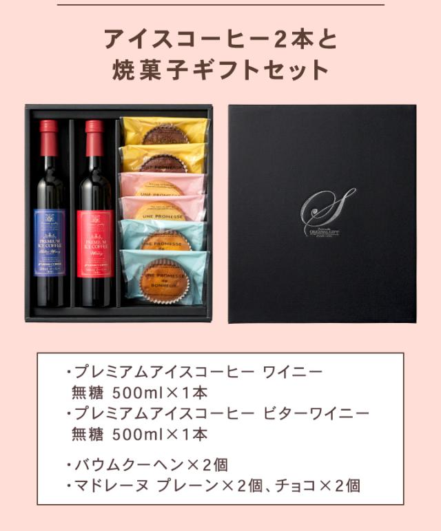 | この商品は、コーヒー専門店がこだわり抜いて作ったプレミアムアイスコーヒー2本と、3種類のスイーツがセットになったギフトです。香り高いコーヒーと、それにぴったりなスイーツで、特別なカフェタイムを楽しめる商品です。 1. プレミアムアイスコーヒーで至福のひとときを このセットには、ワイングラスに注ぐとふわっと広がる香りが特徴のプレミアムアイスコーヒーが含まれています。無糖でさっぱりとした味わいが楽しめるので、コーヒーの深い苦味とほんのりとした甘さがしっかり感じられます。高級感のあるワインボトル型のデザインも魅力で、贈り物にぴったりです。日常のひとときが特別な時間に変わる、そんな贅沢な体験を提供します。 2. コーヒーにぴったりの3種類のスイーツ このセットには、コーヒーの味を引き立てる3種類のスイーツが入っています。しっとりとしたプレーンのマドレーヌ、チョコレートを練り込んだリッチなチョコマドレーヌ、そしてふんわりとしたミニバウムクーヘン。それぞれがコーヒーとの相性抜群で、甘さ控えめなので大人にも喜ばれる味わいです。どれも口の中で優しく広がる香りと味わいが、コーヒータイムをより一層楽しませてくれます。 3. 贈り物に最適なシンプルで高級感あるパッケージ このセットは、シンプルながらも高級感のある箱に収められています。プレゼントとしてそのまま渡せるように、ラッピングと手提げ袋も付いており、ギフトとしての準備が整っています。大切な方への感謝の気持ちを伝える贈り物として、特別なシーンで活躍すること間違いありません。家族や友人、特別な人へのプレゼントに、このセットは最適です。 | |