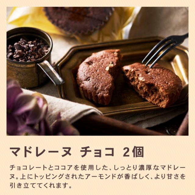 | 内容量 | ・バウムクーヘン ×2個 ・マドレーヌ チョコ ×2個 ・マドレーヌ プレーン ×2個 |