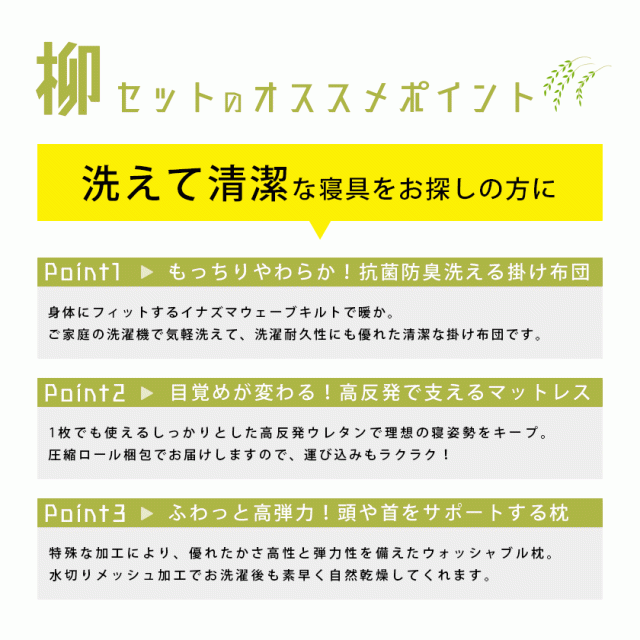 | 「柳セット」は、洗えて清潔な寝具をお探しの方にオススメ。 |