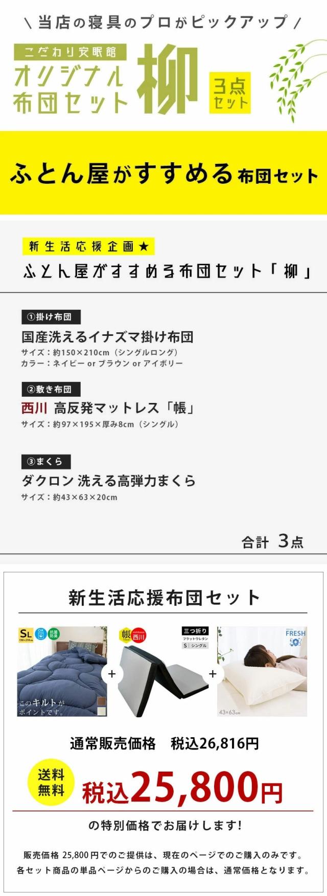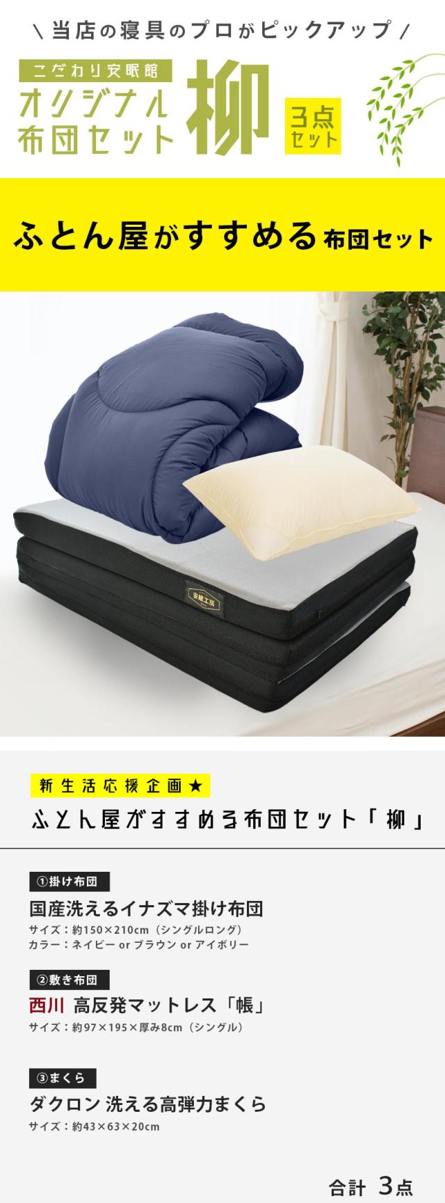【◎】布団セット シングル 3点セット -柳- ふとん屋がすすめるセット 掛け布団 + マットレス + 枕 新生活 寝具セット ※同梱不可