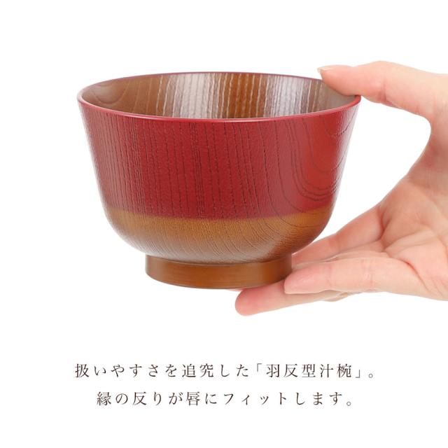 持ちやすさ、扱いやすさを追究した「羽反型汁椀(はそりがたしるわん)」は、縁の反りが唇にフィットします。