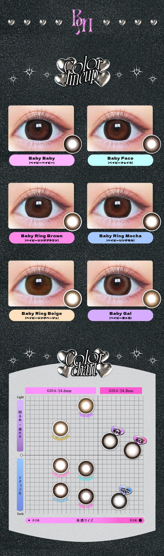 色直径:【14.6mm】ベイビーリングブラウン、ベイビーリングモカ、ベイビーリングベージュ、ベイビーぎゃる、ベイビーチョコ、ベイビーベイビー、ベイビーフェイス、ベイビーチーク、ベイビーメープル【14.8mm】ベイビーデビルベイビー、ベイビーデビルさくら、ベイビーデビルぎゃる